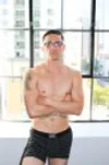Muscular Woody Johnson jerks off his big cock on a couch.