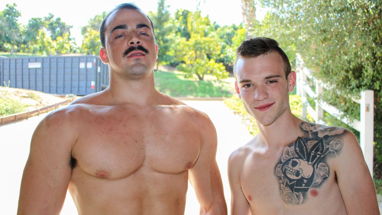 Scott Finn never likes to wait and once he sees Alex James' hard cock he begins taking every inch down his wet throat. Alex moans with pleasure as Scott uses his tongue in more way than one. Alex face fucks him for a bit before Alex decides that he wants to suck some cock. Alex may not suck cock as much but when he does he enjoys every second of it. Scott lets Alex have his way with his cock as he watches him sucking and slurping on his hard cock. Alex bends Scott over the bed and eases his big thick dick into him. Once he balls deep he begins to fuck him hard and fast. Scott can barely take the fucking as Alex continues to thrust in and out of him. Alex fucks him all over the bed in a few different positions until he puts him on his back and pounds the cum right out of Scott's dick. Alex pulls his raw cock out and blasts his nut all over Scott's cum soaked chest.
