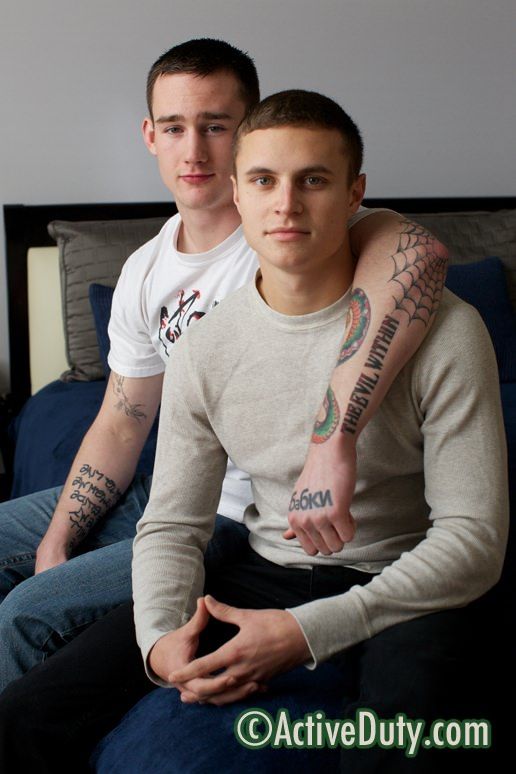 Axl gets onto his back, legs flung in the air around Sawyer's head. Sawyer's going faster and faster now and Axl locks eyes with Sawyer. 'Oh my god,' Axl says, 'I'm gonna cum!' And blamo - out cums a huge load while Saywer's still inside him. Then, Sawyer yells out that he's gonna cum too, and pulls out to shoot his load onto Axl. 'That was fun,' Sawyer says to Axl.