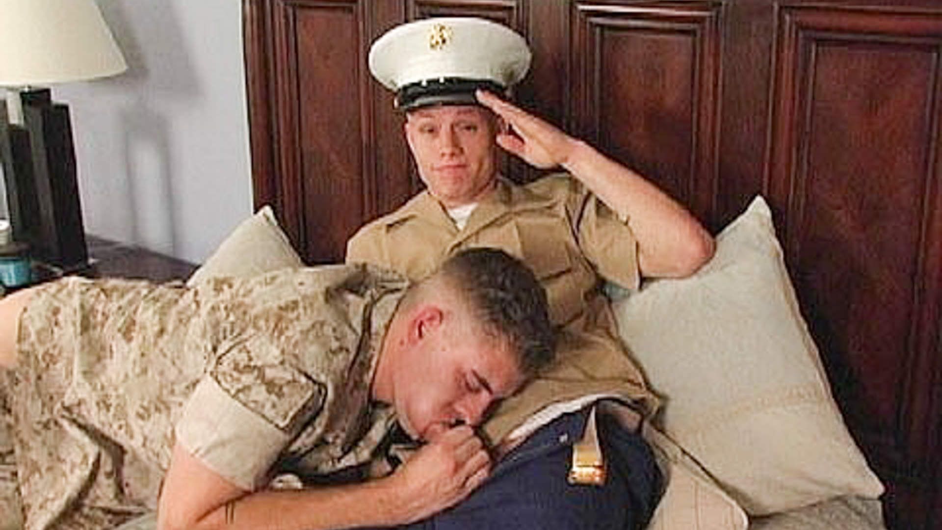 The two Marines work up their hard-ons as I step away. When I come back they are hard and ready and Rodney has his eye on the ball as he watches Lance's cock intently. You can tell he's hungry to taste his buddies cock. Never one to be shy I suggest Rodney do just that. Rodney gets down and starts sucking on Lance's hard dick and licking the shaft. This is so hot to watch as the two Marines in uniform start getting down and dirty. Rondey must be doing a pretty damn good job because Lance is hard as a rock as his buddy chows down on his cock. He's giving it some serious action as he licks and sucks it, taking it all the way down his throat. I get him back on his knees and give him some pointers for tacking a cock down his throat. Rodney starts showing off his skills for the camera. He's got such a beautiful face and smile. I have to admit this guy really got to me. His smile was so radiant and his eyes danced with his smile to make one of the best looking faces I've ever seen on a man. Lance grabs on Rodney's head and fucks his face. Rodney licks and sucks on Lance's balls as Lance unbuttons his shirt for easier access. After plenty of oral attention on Lance...Rodney is ready for some anal attention on himself.