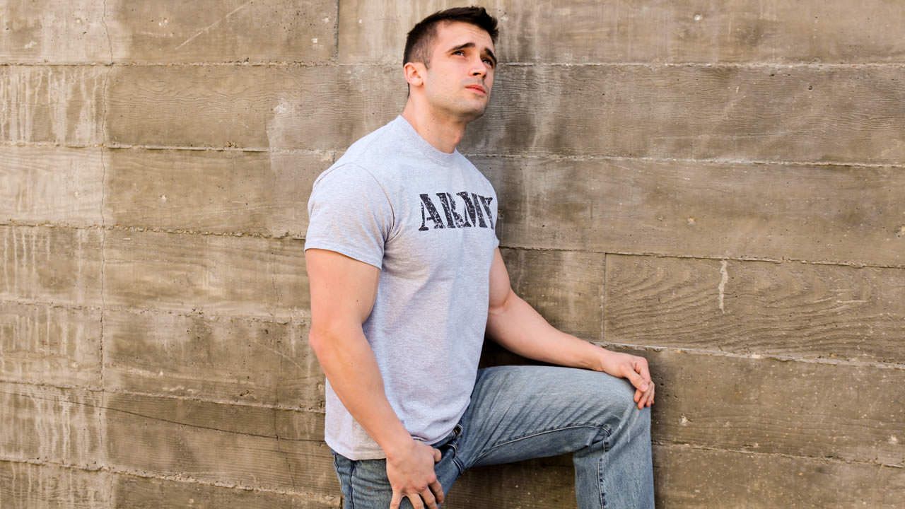 Mathias stands up again from there, and Claude captures another view from over Mathias's shoulder. This is a great chance to check out Mathias's abs. His dog tags bounce off his chest and stomach as his masculine hands work that fat, erect dick.