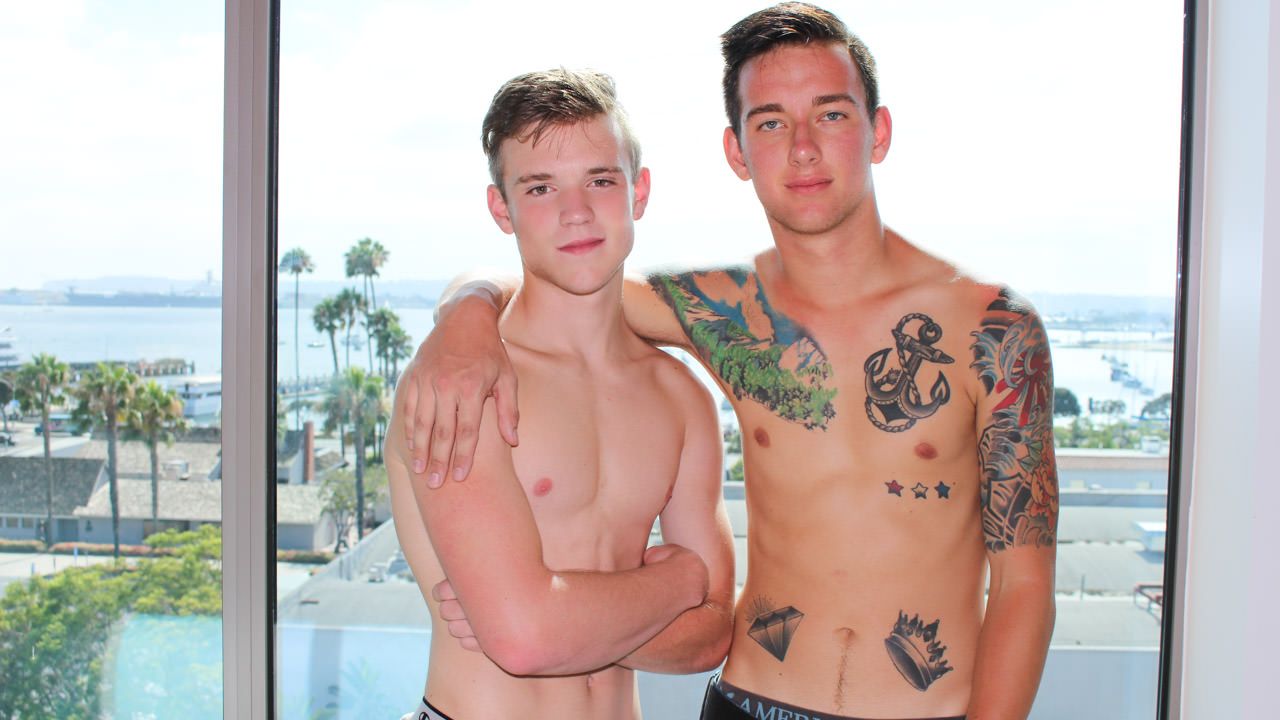 Then, before anything else, the boys sit together on the couch and kiss passionately for a while. I don't blame 'em...good sucking like that only leads to genuine, hot intimacy. And then of course some fucking! Scott gets on all fours on top of a black, leather footstool and allows Matthew to penetrate his tight ass.