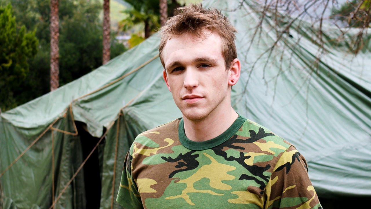 He doesn't waste anytime as he begins to take off his clothes revealing his inked up body and sexy scars from his active lifestyle. His cock is hard as a rock as he slowly strokes his hand up and down his shaft. He was nervous but thats the orginality of it all and seeing him play with his cock is beautiful. Nickolai tends to his balls as he continues to show off his goods for all to see. He strokes his cock slowly and passionately as he builds up those balls. He's most comfortable lying on the bed legs spread out as he gets closer to his climax and with only a few more tugs of that hard cock he finally shoots his creamy load all over his chest.