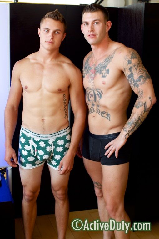 I remove myself from the room after our little introduction and Ransom spares no time getting friendly with Sawyer. Ransom leans over and starts exploring Sawyer's chest with his hands, rubbing his pecs and abs -- all the while Sawyer is just grinning at Ransom. The latter latches onto Sawyer's boxer briefs and unveils his stiff dick.